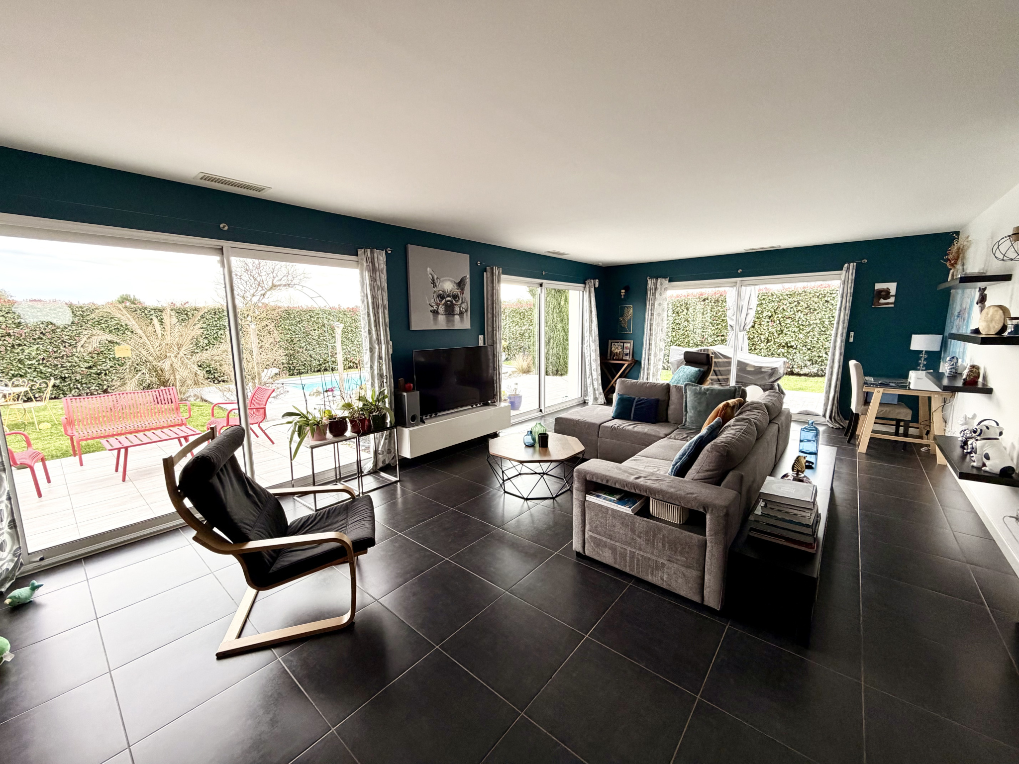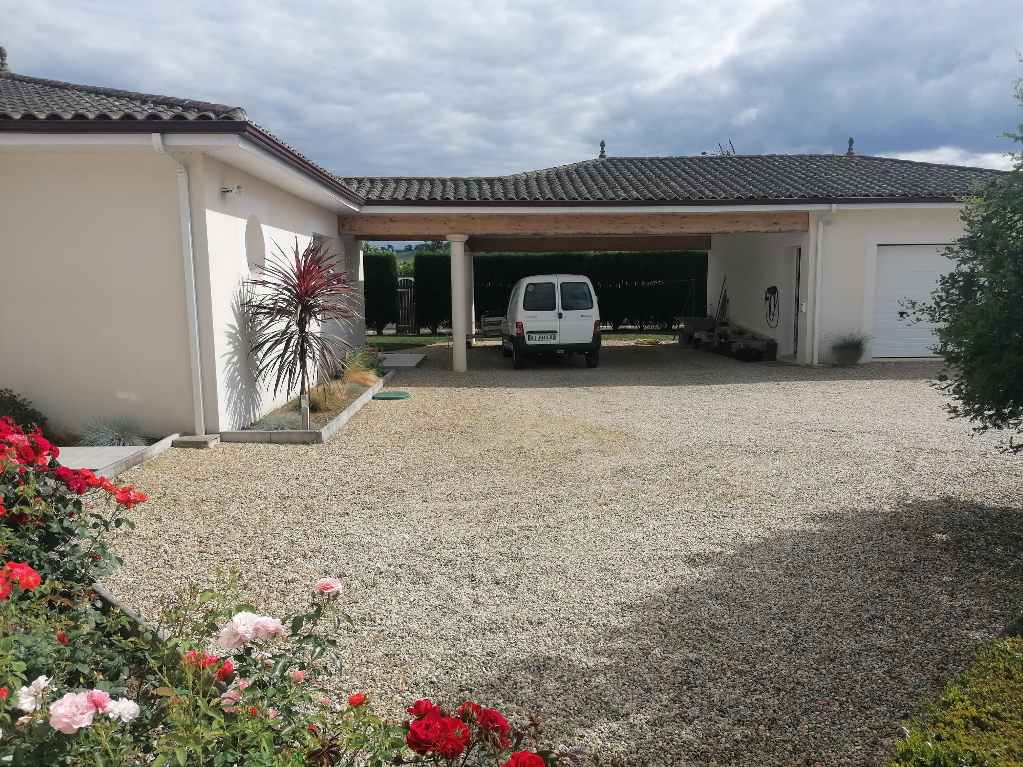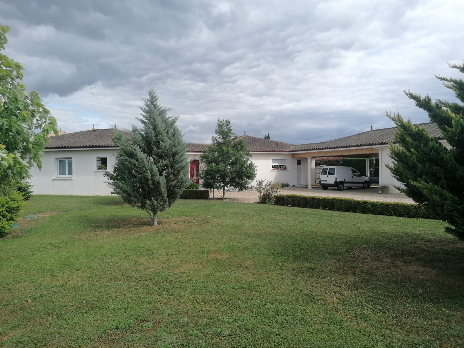 À l'extérieur profitez d’un jardin arboré entièrement clôturé sécurisé par portail électrique avec haies en périphérie de 2m. Double carport de 47 m2 plus garage de 30 m2 complété par un bel espace de stationnement.
