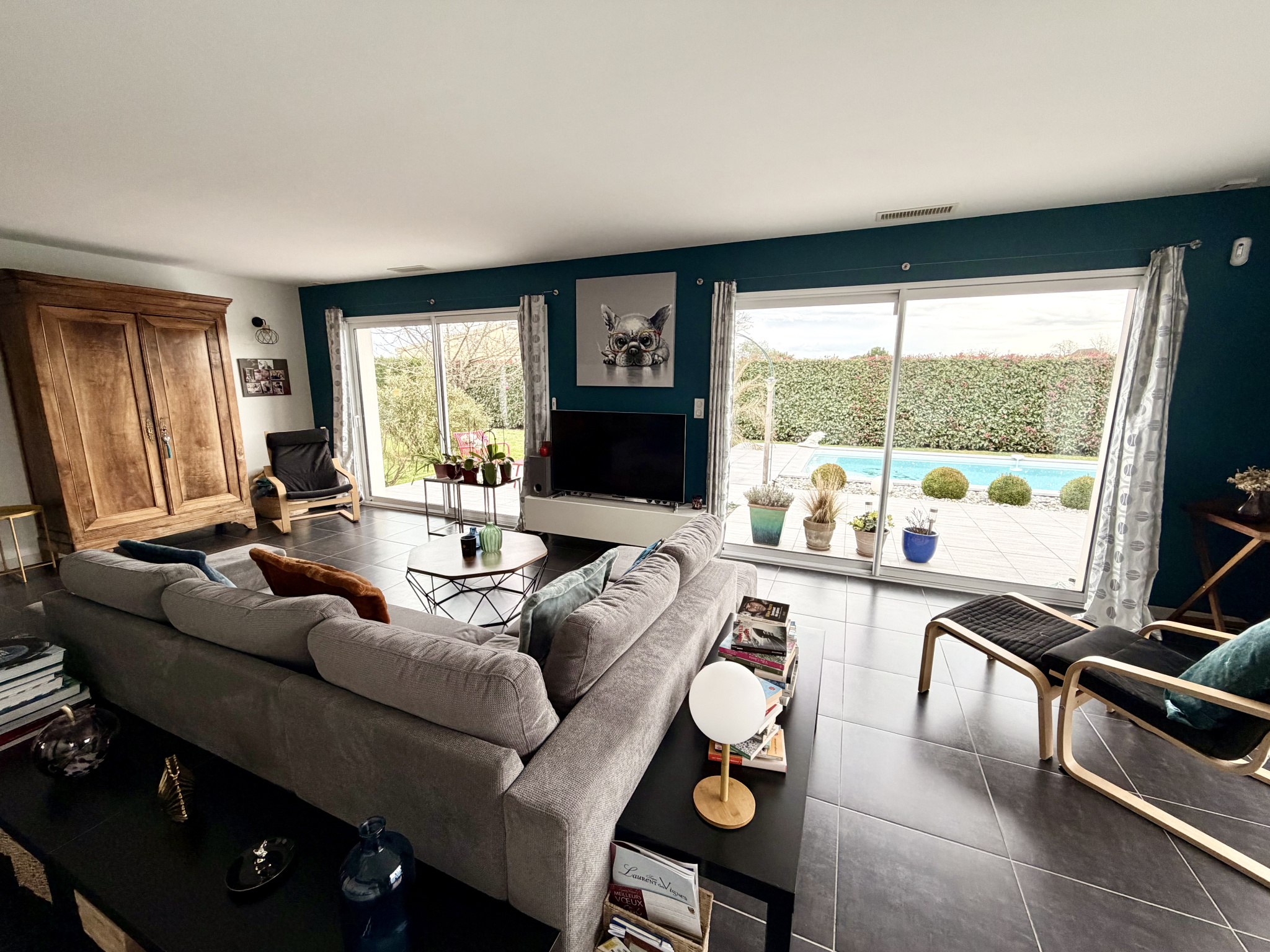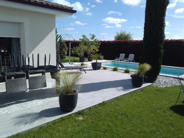 Terrasse carrelée de 55 m2 attenant à la piscine de 7x3,5 m au sel équipée d’un local technique.